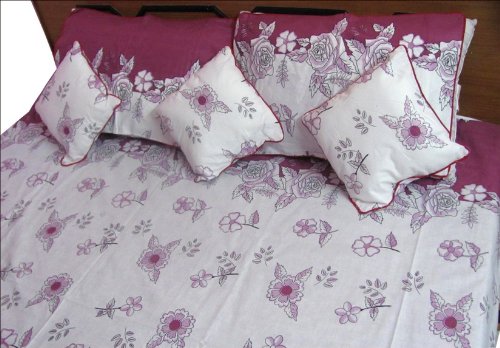 This is a beautiful stylish white and plum color cotton queen size rose flower pattern decorative & elegant look creative bed spread comforter bedspread/bedsheets Along with 2 pillow cover (without filling ) and 3 filled cushion Set.Give your bedroom a new look with this beautiful, classic designs bedspread Set! This is cotton bedspread. Very Stylish Elliot Luxury .Handmade bedding Set Graceful and elegant design bring you to a wonderland.you can completely change the look of your bedroom with this soft, comfortable and cozy bed spreads.you can now turn your bedroom into a luxurious retreat fit for royalty with our wonderful bed spreads collection.Cotton bedspreads are made from cotton that is the most widely used fabric for making any kind of home furnishing.